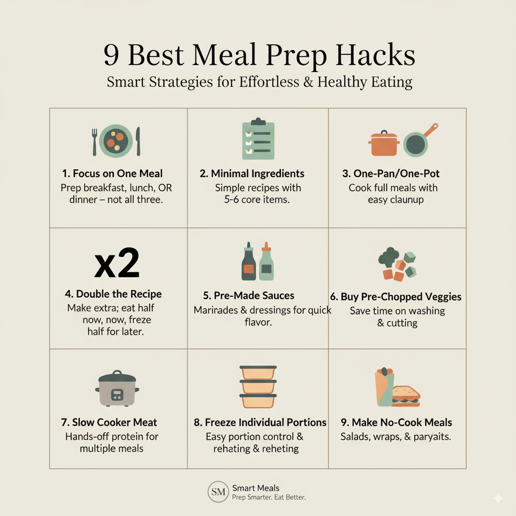 Meal prep has become one of the most effective strategies for eating healthier, saving money, and reducing the stress of cooking every single day. But for many people, the idea of spending the whole weekend chopping vegetables and lining up identical food containers can feel overwhelming and even discouraging. The good news is that meal prep doesn’t need to be boring or complicated. With a few smart strategies, you can save hours in the kitchen while still enjoying meals that are flavorful, balanced, and satisfying. Whether you’re trying to lose weight, fuel workouts, or simply eat better at work and home, these 9 meal prep hacks will help you stay consistent without feeling like a full-time chef.