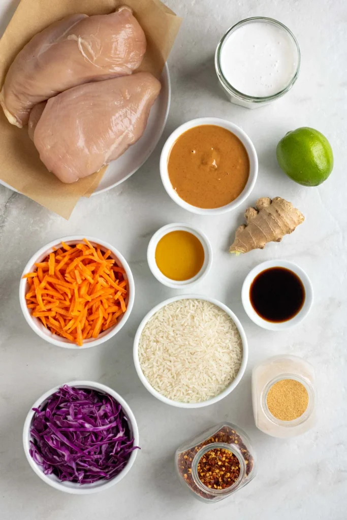 - Assemble the Bowls: Add coconut rice to each bowl, top with chicken, shredded cabbage, shredded carrots, and drizzle with peanut sauce. Garnish with cilantro, chopped peanuts, and sliced green onion.